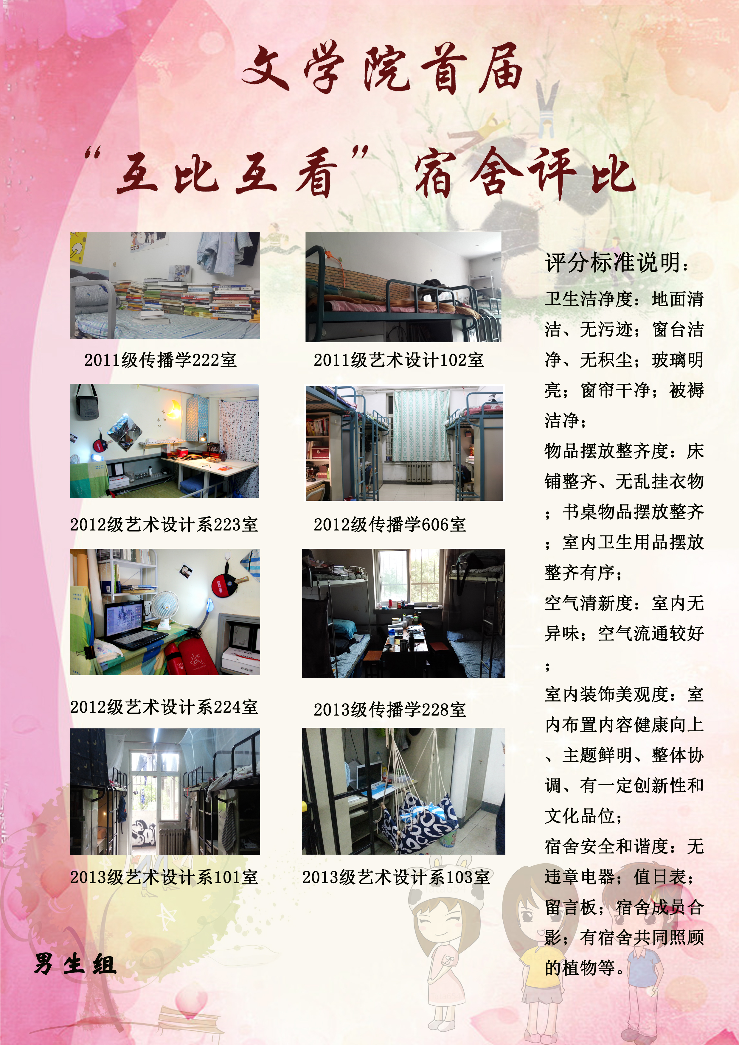 此次比赛面向2011级、2012级和2013级的全体本科生,共分为9个单位,进行跨年级、跨专业宿舍互比互看。每个单位评出一个优秀宿舍,学院予以表彰和奖励。评委由年级辅导员、专业班班长、生活委员、宿舍代表构成。评比内容集中于卫生洁净度、物品摆放整齐度、空气清新度、室内装饰美观度、宿舍安全及和谐度等五个方面。