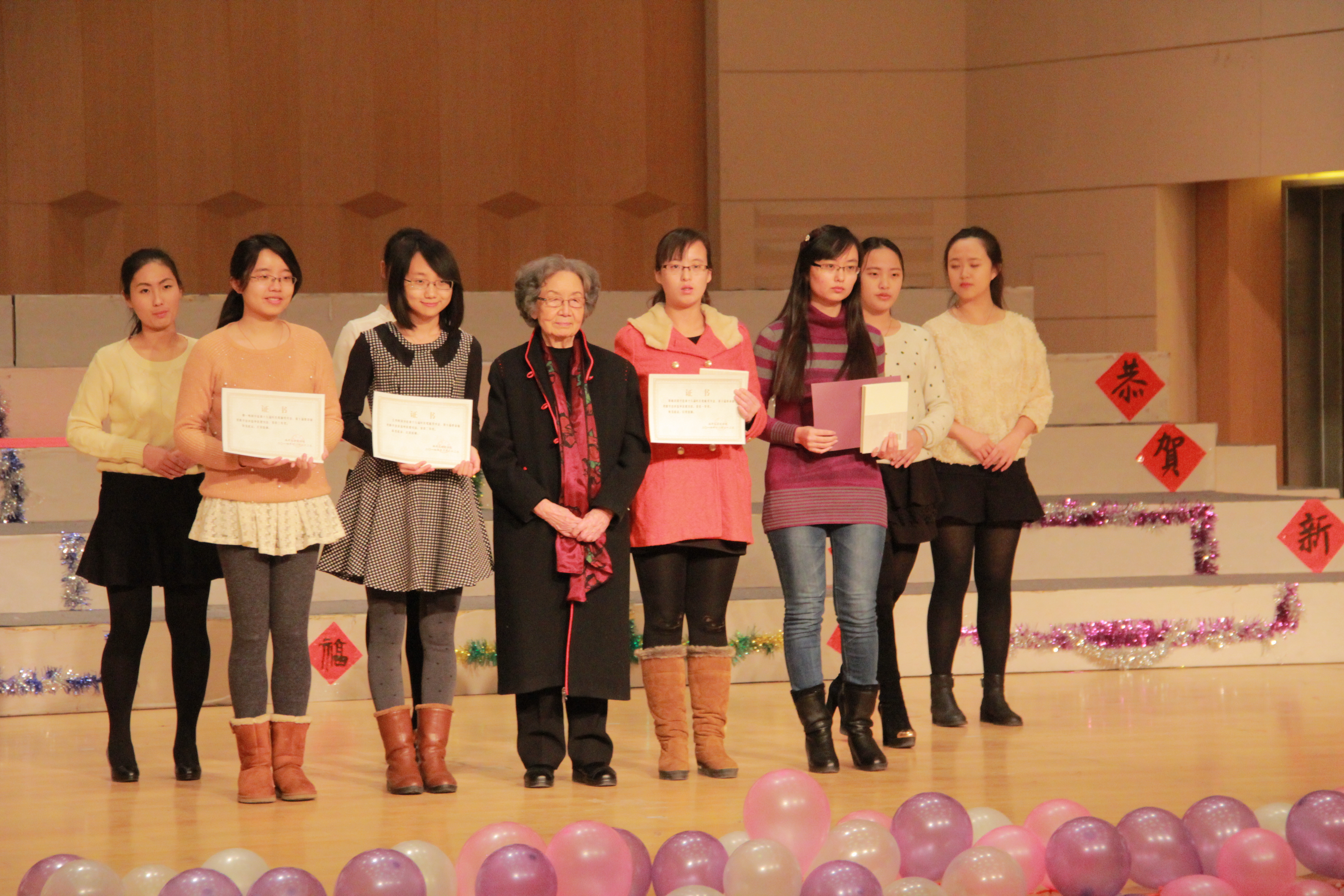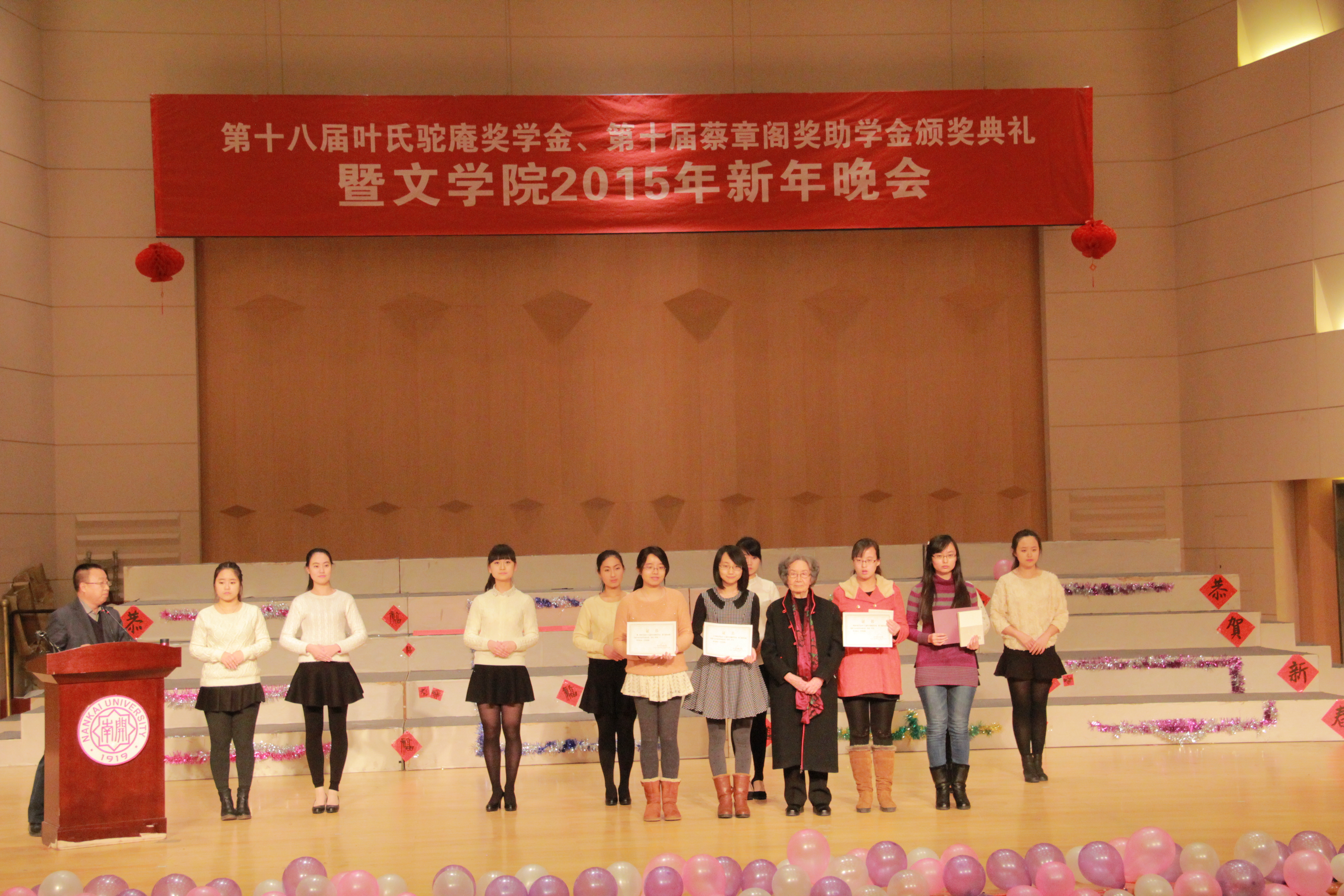 “叶氏驼庵奖学金”由加拿大皇家学会院士、必威betway中华古典文化研究所所长叶嘉莹先生于1997年设立,意在鼓励学子熟诵中国古典诗词。“蔡章阁奖助学金”由香港实业家蔡宏豪先生于2005年设立,意在鼓励学子熟诵儒家经典著作。自2005年开始两种奖学金合并颁发。在这十年间,参加每年新年晚会之前的颁奖典礼,并聆听叶嘉莹先生的谆谆教诲,这已成为一代代文院学子在新年之前的精神盛宴。(通讯员 叶翔 摄影 黄晨茜)