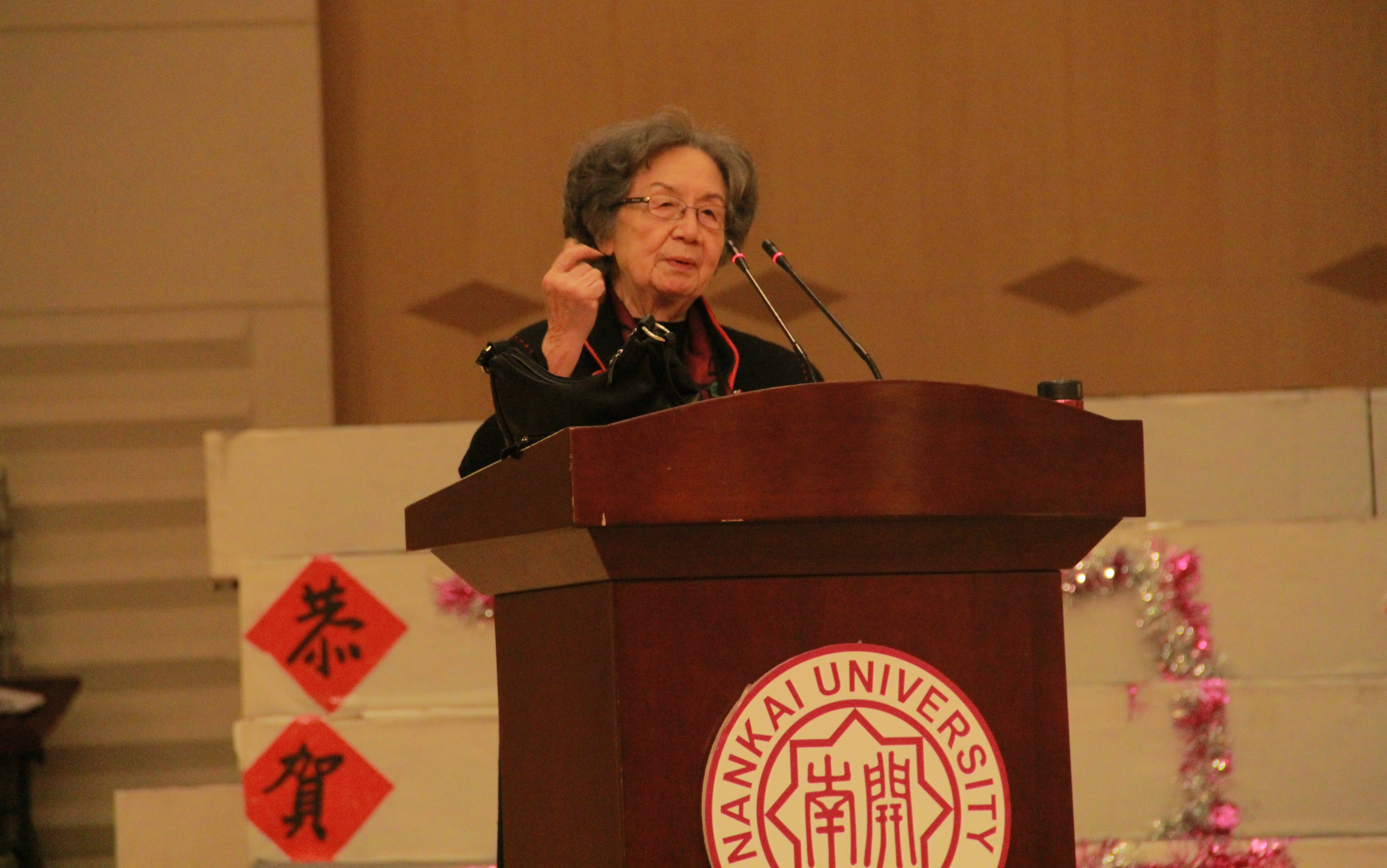 随后,经理沈立岩教授发表新年致辞。他表示,从叶先生身上看见了精神、力量、信仰、坚韧。他提到今天是二十四节气里的“冬至”,冬至在《周易》卦象中意味着吉利,以此鼓励全院师生在新的一年里平安、顺利,并祝叶嘉莹先生健康长寿。