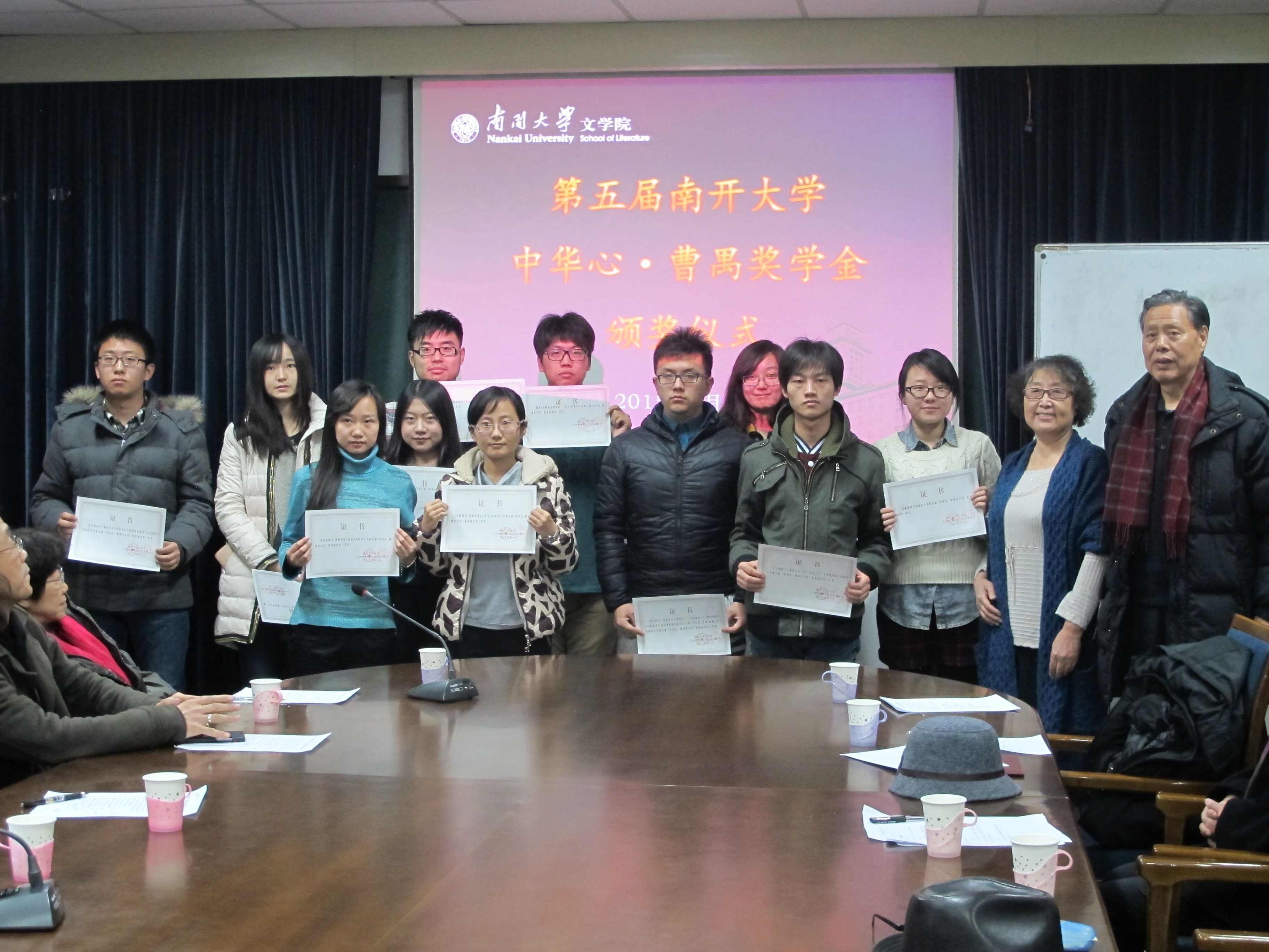 中文系主任乔以钢介绍了“中华心·曹禺奖学金”及此次评审情况,并宣布获奖名单。本年度“中华心•曹禺奖学金”申报评审工作于2014年11月初启动,向全校22个专业学院以及活跃在南开园内的员工剧社发布了评选通知。经过初评、复评和终评三轮评审,确定了获奖名单。
