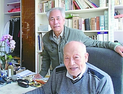历史学家齐红深与杨增志老人(前)在一起。资料照片