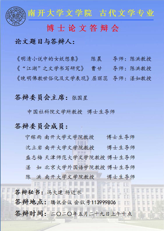 2020届夏季毕业研究生答辩公告——古代文学博士生陈晨、屈丽蕊、曹廿