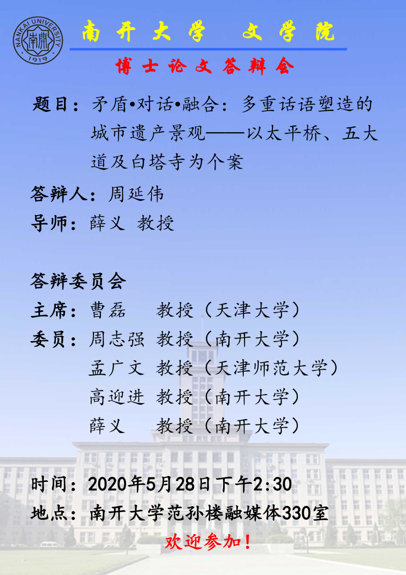 2020届夏季毕业研究生答辩公告——文艺学博士生周延伟