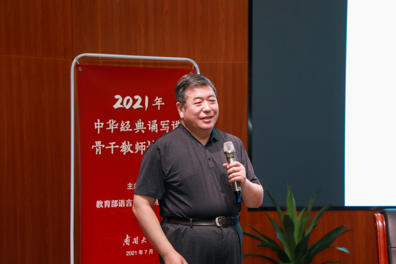 杨继荣代表天津市语委、市委教育工委、市教委协作支援与语言文字处向培训班的顺利举办表示热烈的祝贺。他提出,“中华经典诵写讲骨干教师培训”就是要让中小学教师能够对中华文化经典进行诗文讲解、诗文诵读和规范书写,进一步提升教师中华经典诵读、书写、讲解的专业素养和教学水平,自觉地将传统文化的精髓贯穿到日常课堂教学中,从而更好地传承弘扬中华优秀语言文化。