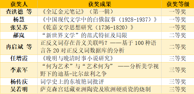 查洪德教授等的古籍整理成果《全辽金元笔记》(第一辑)、杨慧教授的专著《中国现代文学中的白俄叙事(1928-1937)》和张昊苏副教授的专著《乾嘉文学思想研究(1736-1820)》获得著作类一等奖;郝岚教授的“‘新世界文学’的范式特征及局限”和冉启斌教授等的“正反义词存在音义关联吗?——基于100种语言各20对正反义词数据库的分析”获得论文类二等奖;任增霞副教授的专著《晚明与晚清时事小说研究》获得著作类三等奖;李素军副教授的“‘何为艺术’与‘艺术何为’——分析美学视野下的迪基-比尔兹利之争”、杨传庆副教授的“词学史上的东坡艳词批评”和吴若明副教授的“萨克森宫廷藏亚洲陶瓷及欧洲硬质瓷的烧制”获得论文类三等奖。