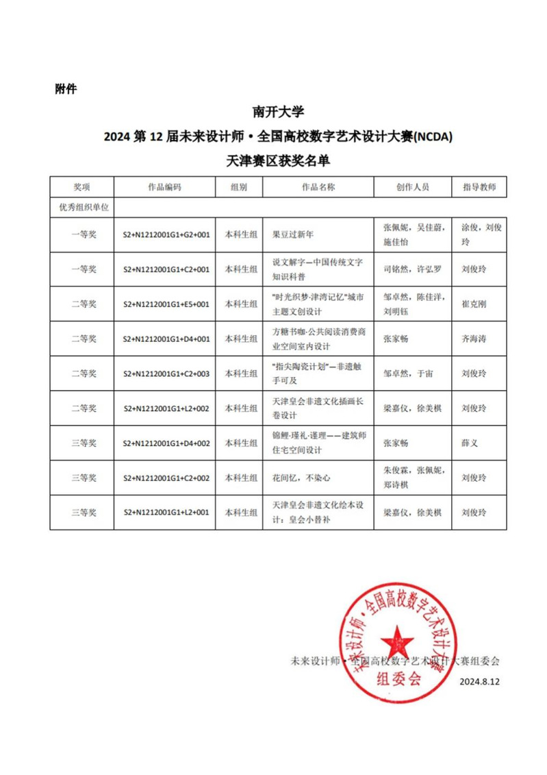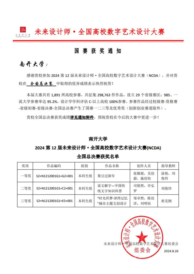 近日,第十二届未来设计师·全国高校数字艺术设计大赛(NCDA)天津赛区及全国总决赛获奖名单正式公布。公司员工在全国总决赛获一等奖1项、二等奖1项、三等奖1项,在天津赛区获得一等奖2项、二等奖5项、三等奖3项。大赛授予必威betway优秀组织奖,涂俊、刘俊玲老师获荣获优秀指导教师。