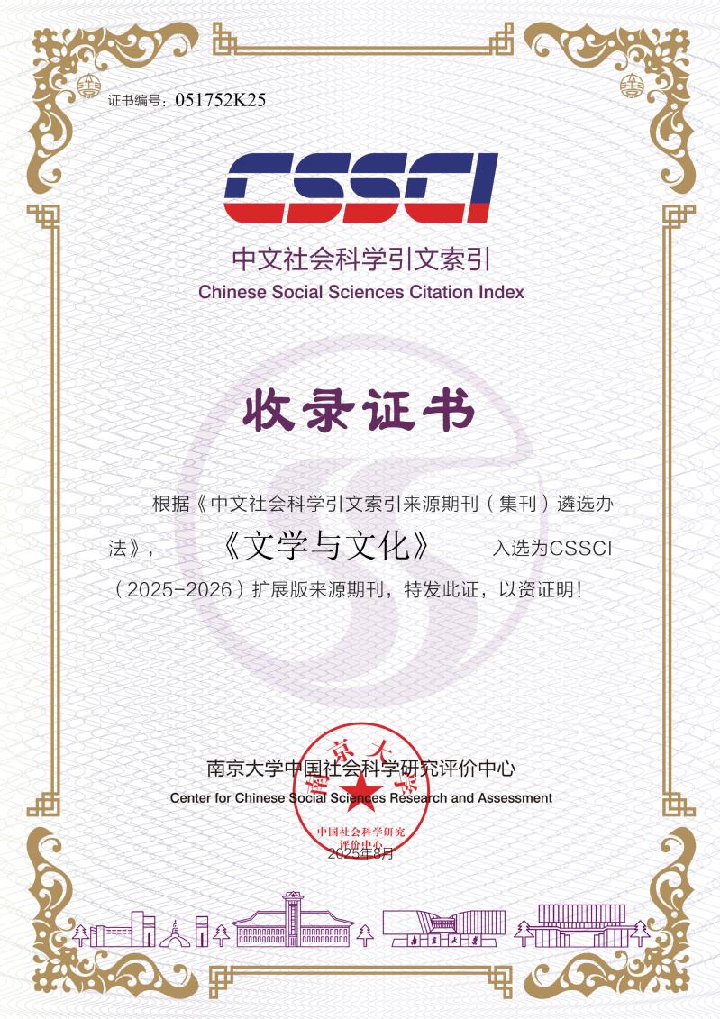 CSSCI(2025—2026)扩展版来源期刊收录证书